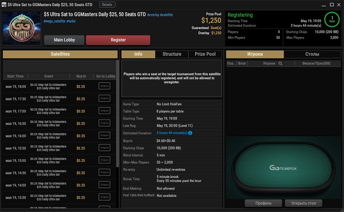 19 мая в 19:00 мск пройдёт эксклюзивный сателлит $5 Ultra Sat to GGMasters Daily $25, 50 Seats GTD.