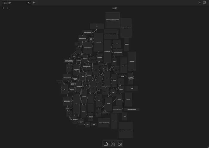Работаю в Обсидиане, классная прога, когда только узнал про нее, сразу понравилась. Особенно опция холста. Это как типа в фильмах, когда что то расследуют, то на доску крепят фотографии, вырезки и прочее, соединяя их красной нитью. Так и тут, но только в электронной форме.