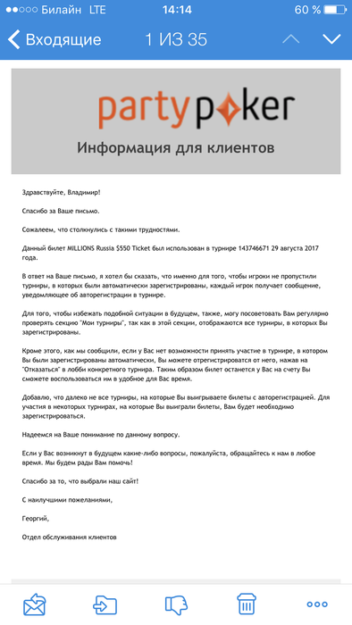 Так и живём , кому то дарим и возвращаем а у кого-то тупо пиздим и сожалеем потом, да много грязи слышал про этот рум, но до конца не верил пока сам не столкнулся, просто отпало желание вновь катать и отбираться, ведь была проделана работа, я ежедневно катал саты по 22$, потратил не мало денег , ради чего ? Чтоб просто меня зарезали и я не знал об этом? В чем моя вина? В том что я не сидел сутками и не караулил а не заберут ли билет? Или в чем ? Я несколько раз перепроверит что я не зареган ни в одной из фаз, скрины почты есть и писем там нет, чароит ссылается что на маил письма не всегда доходят, но при беседе с сапортом они же приходят! Пати как вы хотите привлечь людей в свой рум??? Подачками за 2.20? Так вы лучше ни чего не дарите, но и честно зарабатоннон не забирайте!!!