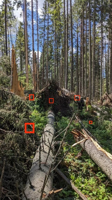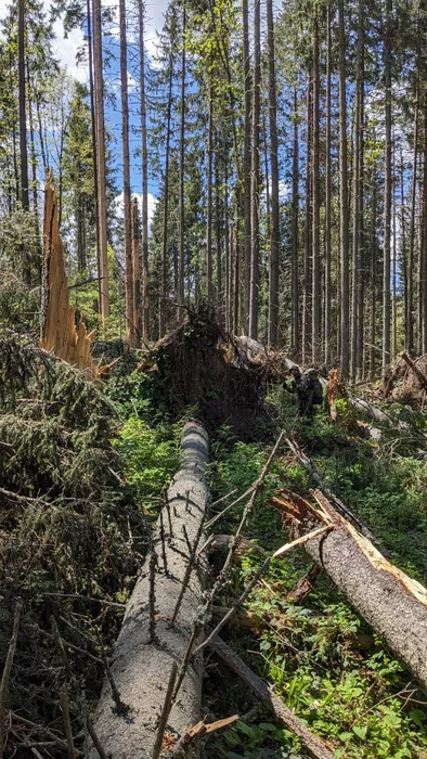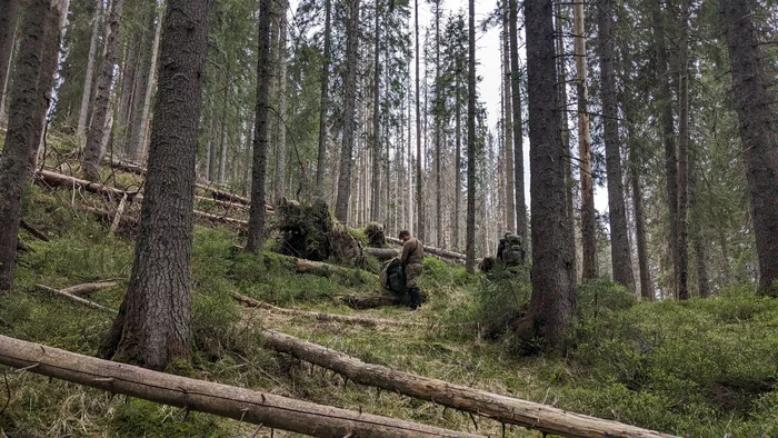 Вскоре мы были готовы выдвигаться. Первым опасным препятствием у нас на пути был туристический маршрут. Мы спустились к нему вплотную, я засел в ветвях елки буквально в 3 метрах от каменистой дороги. Я разглядел следы то ли от двух мотоциклов, то ли от квадроцикла. Трудно было понять свежие следы или нет, дождя не было несколько дней. Немного послушав шум леса мы рванули. Чем ближе мы находились к границе, тем очковее становилось в таких опасных ситуациях. Пройти такой путь зря никто не хотел. Подъем мы одолели без последствий. Обойдя холм нас встретила небольшая впадина просто с хуевой тучей поваленных деревьев. Видимо сюда их скидывали лесорубы с равнины на другом холме, хз. Мы пролазили между поваленных деревьев, прошли по бревну, на высоте 2 метров,было опасненько, падать пришлось бы на торчащие сучья и бревна.