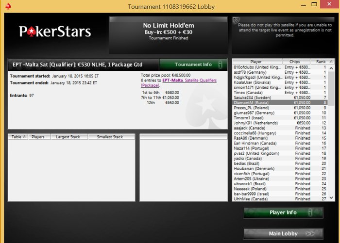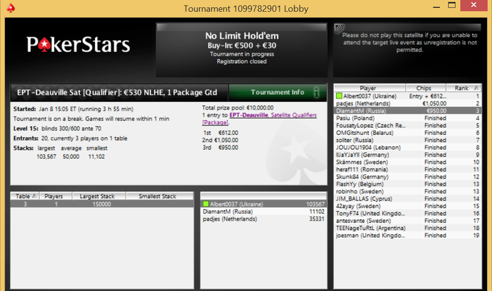 Poker Stars, $665 Buy-in (200/400 blinds, 50 ante) No Limit Hold'em Tournament, 9 Players
