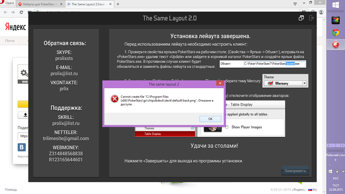 Prolix @ 22.9.2015 CTAPYXA, Запустить от администратора, и отключить атрибут каталога PokerStars7 и подкаталогов "Только для чтения", если не поможет можно установить в другое место и потом заменить вручную.