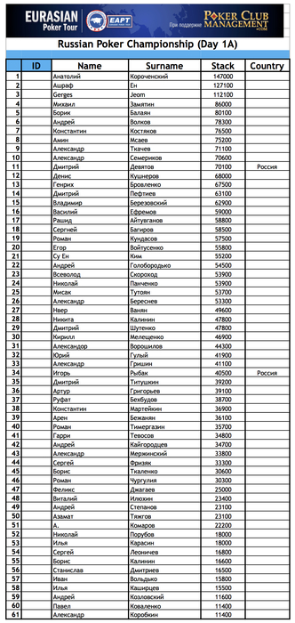 EAPT Cup по 100 - 7 уровней по 15 минут. Есть день 1А, 1B, 1C, 1D, 1E - 24 января - объединяющий день, стеки суммируются.