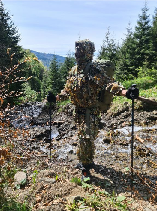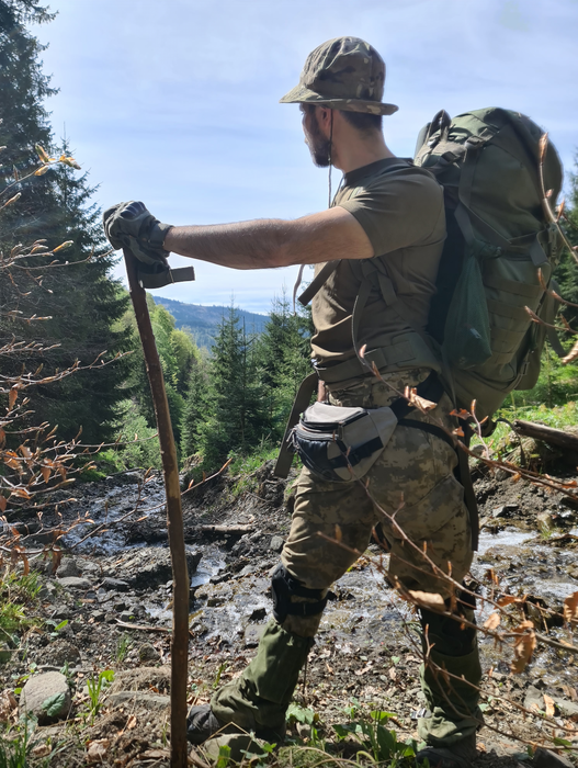 Дойдя до очередной складки местности, Саня увидел какое-то строение возле дороги. Мы дали угла через верх и только почти обойдя объект, брат увидел в монокуляр, что это была беседка. В углу лежал вроде бы спасжилет, больше ничего не наблюдалось. Впереди внизу был небольшой ручей, который хорошо просматривался с дороги, а за ним очередной подъем по полулысой местности. Мы аккуратно спустились и также поднялись, впереди оставалось пересечь всего одну тропу на территории Украины.
