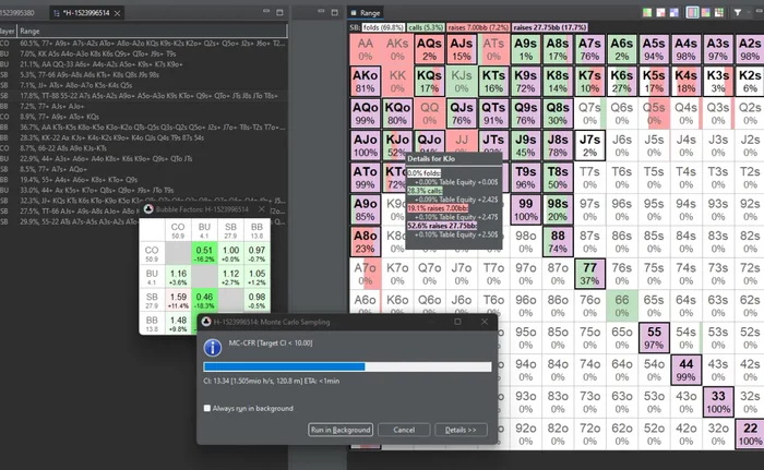 Считал пуш на ФТ свой в ноке : CO 50бб рейз , на бу 3.5ббпасс, я на сб 27бб пуш KJo, BB 13bb fold.