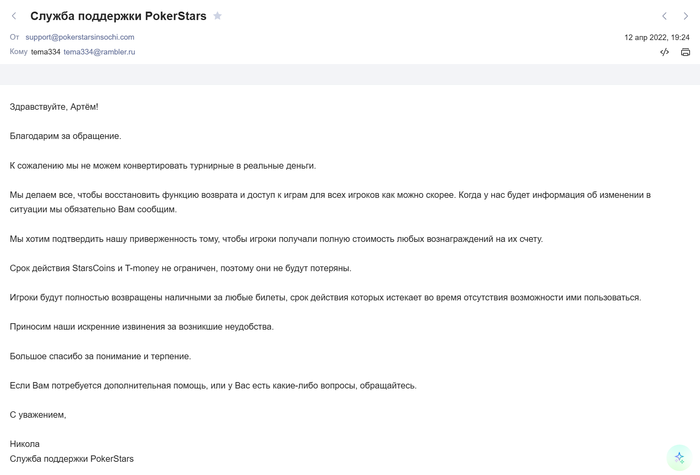 напишите, если есть желание. в саппорт именно PS Support английский., а не Сочи в твиттере. В личку. может они что разъяснят.Я всегда им писал для начала, а потом уже на почту Сочи. Если вы не переходили с него на PokerPlanets.
