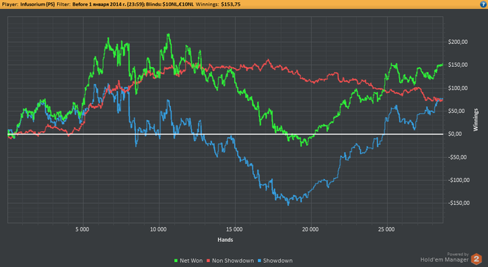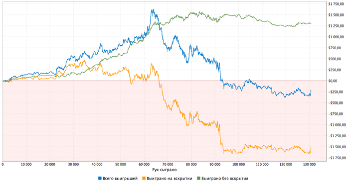 Nudler_King @ 25.10.2014 Думаю, тут фишка в том, что тот, чей график, играл сначала ТАГом, потом переключился на ЛАГа, неплохо плюсанул вначале на блефах + доездах, а потом опы начали его широко вскрывать, а он не подстроился, не снизил частоту блефов (особенно на ривере и против линий чек-кол) и по итогу залился. Так обычно и бывает. ЛАГ - очень гибкий стиль, надо уметь подстраиваться под поле.