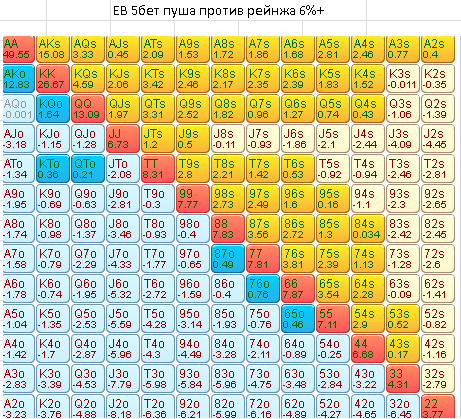 Обратил внимание, что когда играешь c большим впипом, опы постоянно норовят переставлять твои рестилы. Даже не смотря на твой 3бет (хотя у меня он не большой). Ну я подстроился под это дело. Беру в руку сильный спектр AQ+, JJ+ и слабые мастевые тузы для баланса и 5бет пихаю. Очень выгодно получается.