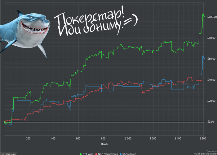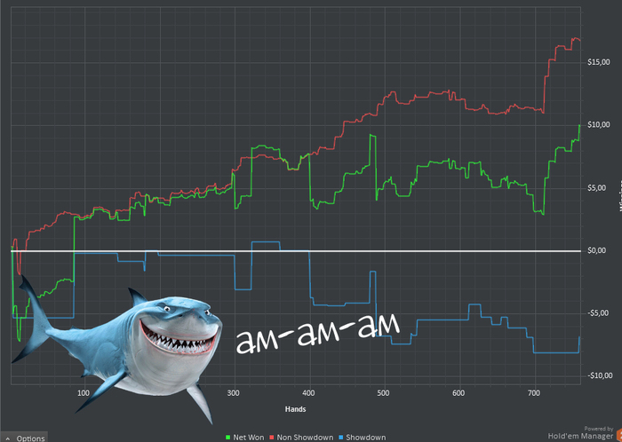 Самый прикол, что в этом графике я насчитал ошибок примерно на 10$. Один раз я упоролся в тузы там, где не должен был. Минус 5$. Два раза поставил жирный овербет в блеф на ривере В РЫБУ БЛЯТЬ которая инстазаколила один раз со второй парой и один раз с топпарой и кикером 9 на закрывшимся флеш-стрит борде. Минус 3$. И недобрал там, где должен был еще порядка 2$. И это в ситуациях на 700 рук! Я хз че ныть про то, что рыба пушнула 77 и уебала твои тузы, когда у каждого в простых ситуациях нереализовано эквити вагон и тележка, а ошибок и того больше.