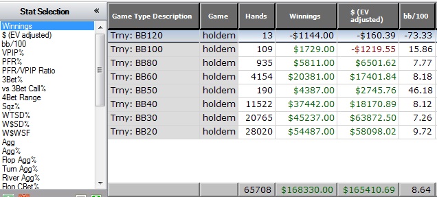 Сыграл сегодня 171 турнир, 31к фишек, +30би (ни разу выше х6). 14к фишек и 10 би по моему маловато. Если меньше 180 фишек за игру, то нах вообще садиться играть.