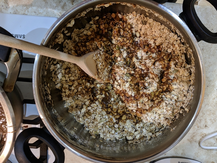 Подготавливаем овсяные хлопья и любимые орешки и семена (сырые) Тщательно перемешиваем с жижей, что выше)