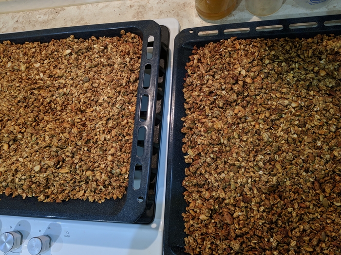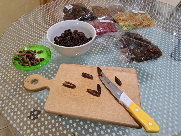 На протвинь и в духовку, разбиваем комочки и перемешиваем каждые 10 минут. А пока финики сами себя не нарежут