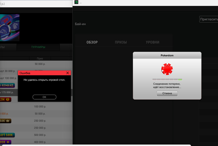 Это потому что я не выходил на момент сбоя. У брата пропадал интернет, его теперь больше не пускает назад. А у меня столы которые были открыты раюотают, но только до момента пересадки. Новые турниры которые я регистрировал тоже не открываются, только байин забрали