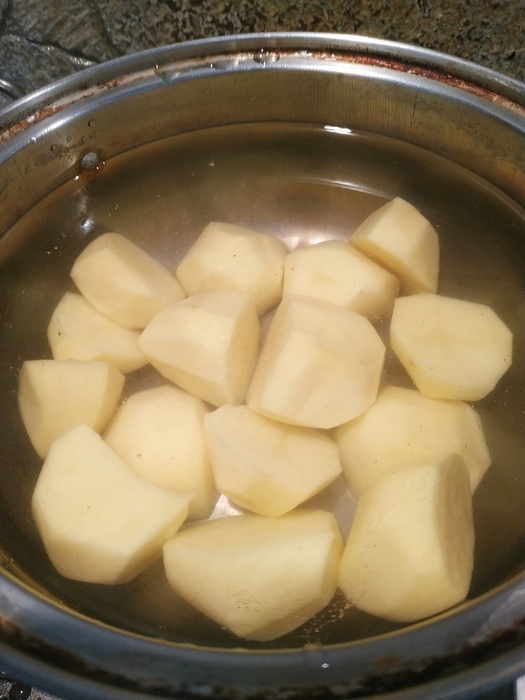 Начинаем делать начинку. Картоху режем пополам и кидаем отвариваться.