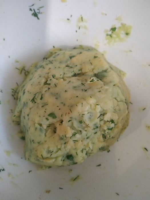 Параллельно, трем сыр и режем зелень мелко мелко. Картоха сварилась. Делаем пюреху, добавляем туда сыр и зелень. Это уже так вкусно, что пару ложек ушло в самое укромное место моего организма=)