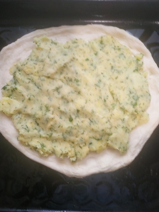 -Полтора стакана муки; -1/3 чайной ложки соли и столько же сахара; -чайная ложка сухих дрожжей; -пол стакана молока; -для начинки:6 небольших картошин, 200 гр. сыра, пару веточек укропа и петрушки.
