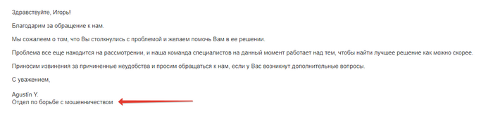 Интересно получается, сначала мое обращение рассматривал отдел поддержки, а сейчас пришел ответ от "отдела по борьбе с мошенничеством"