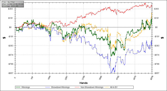 Конечно, он много выкидывает, и на красной линии я делаю плюс (что заметно на графике), но результат матча с такими противниками зависит от этих раздач:
