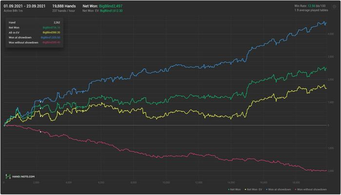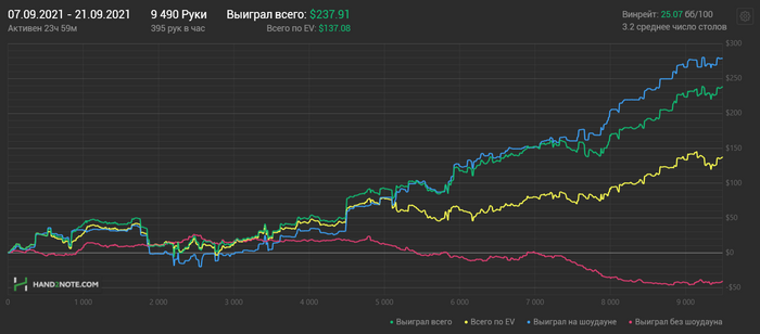 Теперь по сути: до марта 2021 я катал сугубо нл2 в 5-6бб/100, отрабатывая 1 и 2 занятие по курсу. Было много ошибок, но сейчас я полностью это понимаю - абсолютно из за моего эго и невнимательности. Если б я подошел уже тогда к этому делу более тщательно, ожидаемый вр был бы 10+/100, и это только первые два занятия. с марта 2021 я перешел на нл5/10, катал до июля примерно 7бб/100.