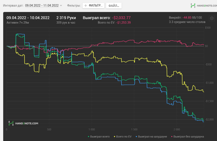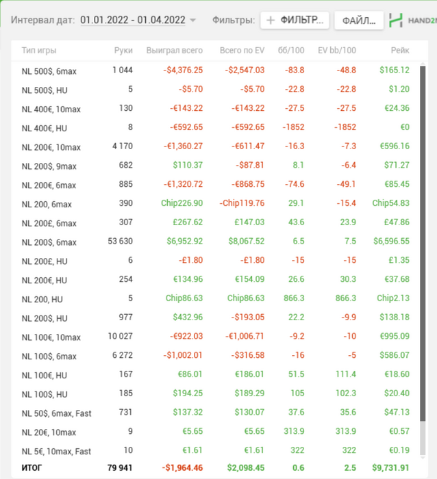 Турниров отыграно: 590 (в феврале было 408 кстати) Прибыль с МТТ: -3358$ (уууух нооорм так подслили БР :))) Рейкбек: +286$ (в феврале было 215) Лидерборд и прочие бонусы: +146$ (на порядок меньше чем в прошлом месяце, ввиду того, что мы отказались от ФлипНгоу)