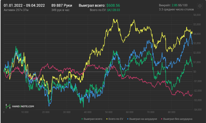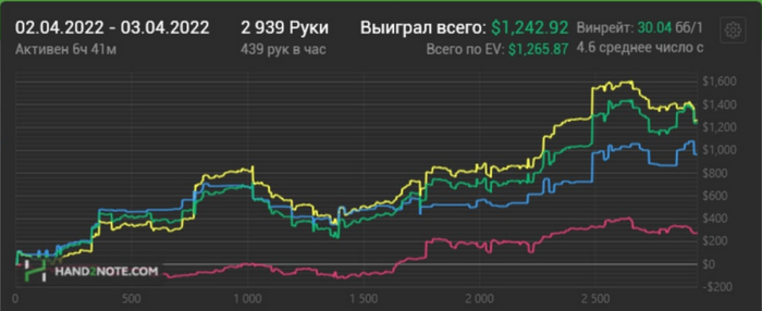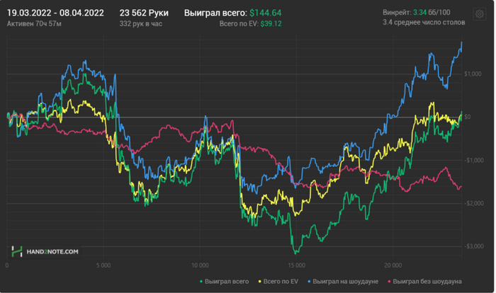 Сумма для кого то может показаться большой, но по факту на моих лимитах это 100 байинов. Да много, но не критично, благо БР позволяет продолжать играть те же лимиты. Год по прежнему идём в неплохой плюс, думаю в апреле ситуация наладится, ибо я в своей игре уверен :)