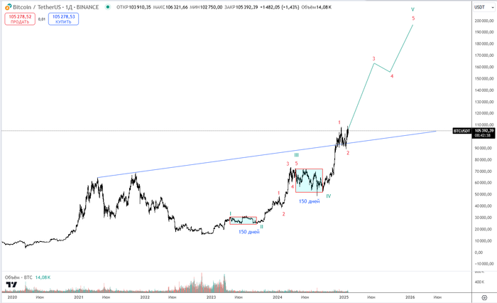 И вроде бы 100к - это то число, где V-волновка заканчивается и дальше нас ждут опять 350-400 дней коррекции до нового цикла, но у Трампа другое мнение. И теперь можно ожидать, что волна V будет удлиненной и сейчас уже образовались 1 и 2 подволны и начинается 3 в рамках V. Драйверов роста для этого хватает.