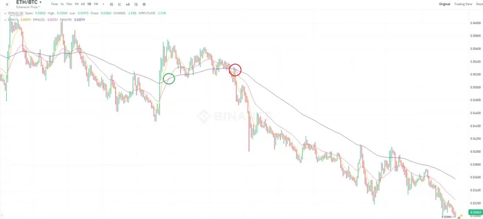 Когда скользящие средние пересеклись сверху-вниз (красный кружок) я закрыл свою сделку с эфиром (при курсе около 0.05). Я на этом довольно много потерял. Такое бывает - не все сделки будут в плюс, бывают ложные сигналы.