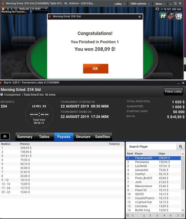 Получилась долгая сессия. Обычно я заканчиваю в 17-18 часов. Сейчас только что от усталости сотворил фигню в последнем турнире. Подарил стек чипаку( В начале казалось, что меня везде нагибают, но настрой от этого не менялся.
