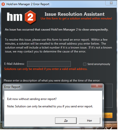 4. Запускать HM2 непосредственно из папки: Пуск> Мой компьютер> C: \ Program Files (x86) \ Holdem manager 2 \ holdemmanager.exe. Должно помочь!