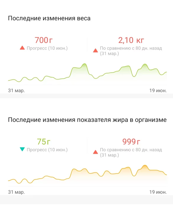 С момента начала путешествия набрал 700г веса, причём уменьшил при этом количество жира в организме (!) на 75г.