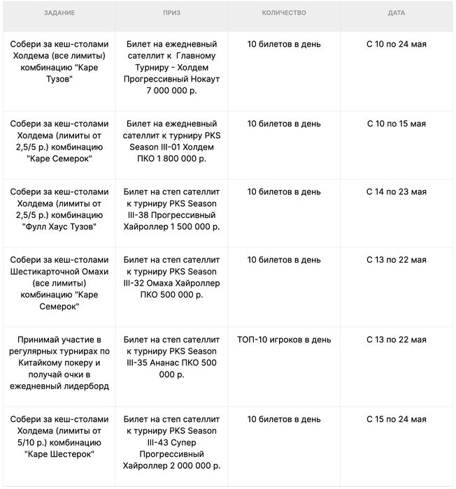 Хочешь сразиться в ключевых турнирах серии? У тебя есть шанс получить билет через сателлиты, которые стартуют совсем скоро! Следи за покерным лобби. А ещё проще – выполняй специальные задания и пробивайся в сателлиты без бай-ина. Задачи появятся уже в ближайшие дни!
