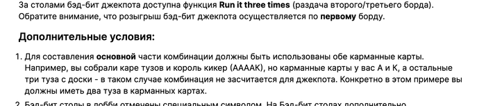 1. Для составления основной части комбинации должны быть использованы обе карманные карты. Например, вы собрали каре тузов и король кикер (ААААК), но карманные карты у вас А и К, а остальные три туза с доски - в таком случае комбинация не засчитается для джекпота. Конкретно в этом примере вы должны иметь два туза в карманных картах.