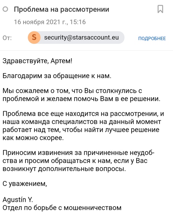 Да вряд ли старс хочет кинуть. Возможно, что они отправили деньги как обычно. Но на стороне банков возникла некая проблема. И сейчас они сами не могут понять что происходит и пытаются разобраться с банками.