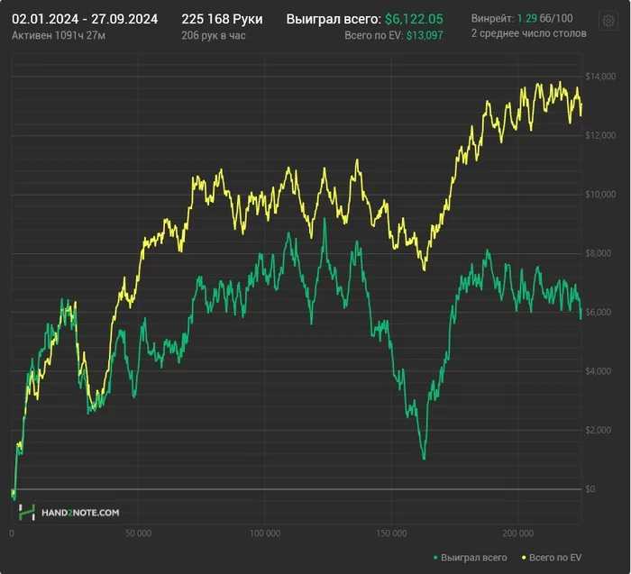 Оказывается преодолел еще одну интересную отметку, 205к рук в минус на данный момент. То есть по факту, без учёта рейкбека я ничего не заработал с конца января. Так же это мой самый длительный стрик за всё время что я играю в покер. Предыдущий антирекорд был 200к рук в ноль, в далёком 2021 году.