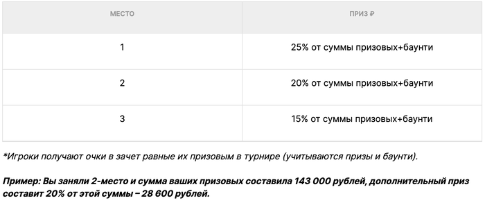 Ну и напоследок мы подготовили отдельную награду, сумма которой не ограничена и зависит только от тебя! ТОП-3 игроков по сумме призовых и баунти за время мини-серии получат до 25% от общей суммы, а потому не бойтесь рисковать, ведь кто не рискует – тот не получает крупные призы!