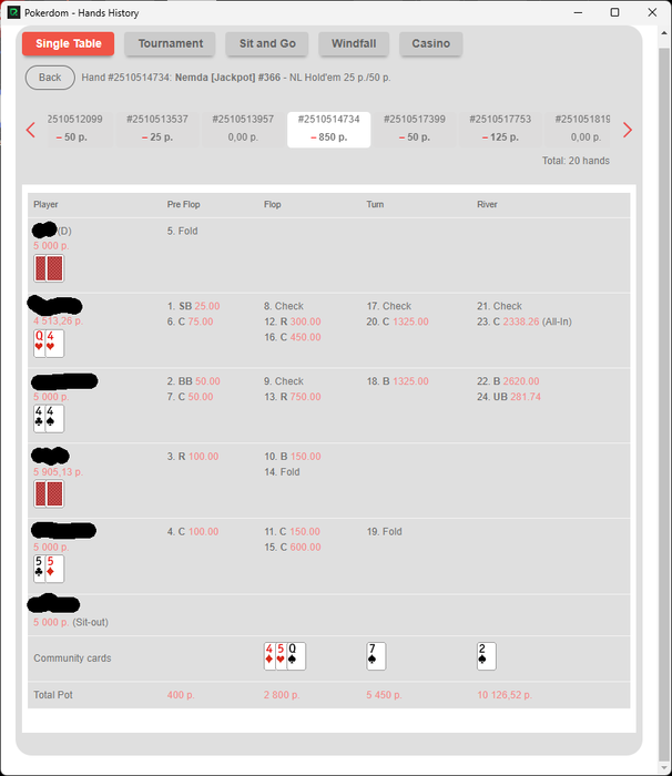 Я играл 6 столов и около 5 стартанул пустых (в сумме 11). На одном столе проходила раздача со скрина, где как только на терне мой ход - КЛИЕНТ ДЕЛАЕТ ЛОГ АУТ(моментальный тупо лог аут без подвисаний). Он частенько виснет и вообще закрывается(но всегда дает дисконнект таймбанк, поэтому проблем никогда не было), а тут впервые делает логаут, я сразу ввожу код 2хфакторной аутентификации и мне открывают из 11 столов ТОЛЬКО 3, без главного со скрина и без дисконнект таймбанка.
