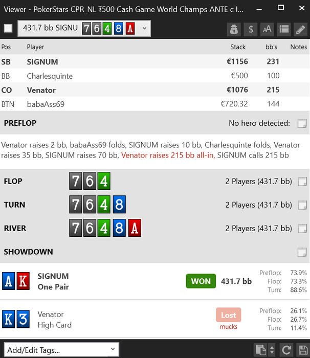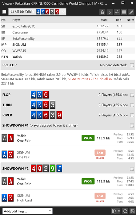 Почерпнул много интересных моментов по стратегии и перешёл разбирать раздачи Стефа. Я реально считаю, что он играл чемпионат левой ногой на куче столов в дипах. Особенно контрастирует это с победителем чемнионата нашим, который медитировал, гулял, разбирал раздачи и тд. Плюс там были фиши и многие реги действительно селектили составы. Тот же Yafish рег более низких лимитов, но показал отличный результат.
