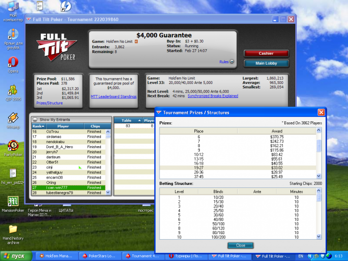 Сегодня (вскр) играть вообще-то не собирался. Съездил на гору , приехал в 24 часа и вроде бы надо спать ложиться), но блин, режим то сбит, решил поиграть турниры немного, доли на сегодня не продавал, пришлось играть от себя, учитывая, что бр в сумме долларов 15 )))