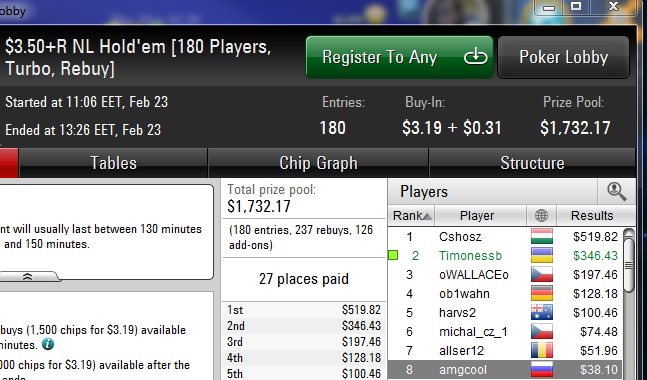 Играть конечно там одно удовольствие,словил 6 раз сет с флопа, два раза меня пытались толе вскрыть толе выбить я так и не понял но было весело!