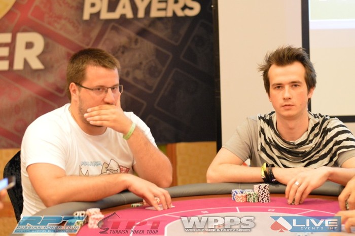В игре 51\105, средний стек - 60K, блайнды 400\800, ante - 100. Среди прочих игру продолжают: Карен Назарян Григорий Родин(на фото слева) и Антон Афанасьев (на фото справа) Евгений Гаврилович Дмитрий Гришин