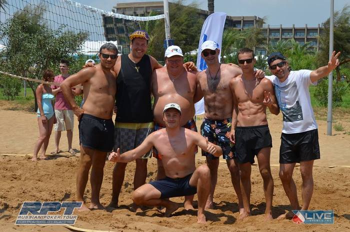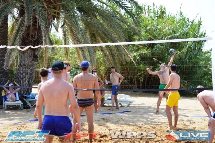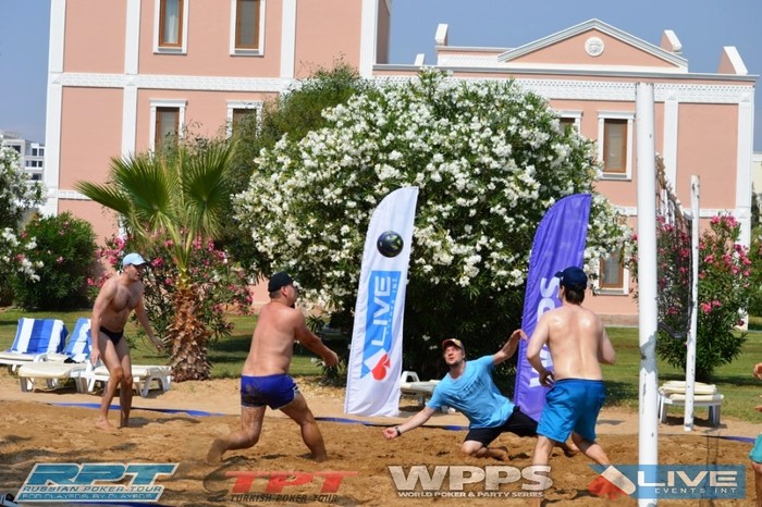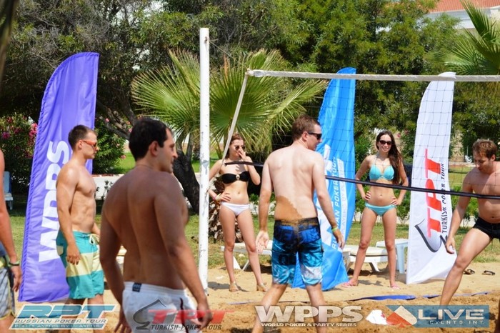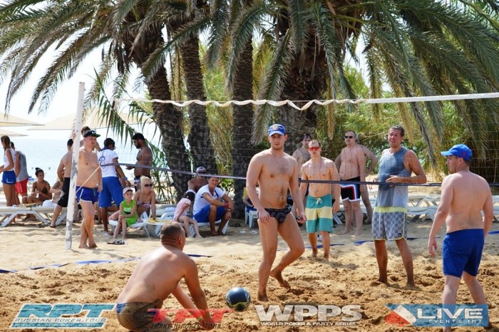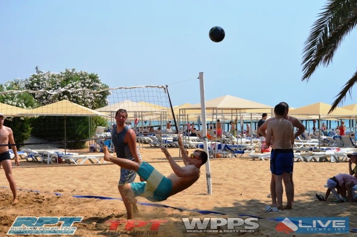 А пока Гранд еще только готовится к началу, а игроки занимают свои места за столами, расскажу о прошедшем всего пару часов назад турнире по пляжному волейболу. Точнее нет, это должен был быть турнир по волейболу, но разыгравшиеся в пылу спортивных страстей покеристы, решили назвать сие действо подготовительной тренировкой, а сам турнир с названиями команд, серьезным подходом и проработкой стратегии() провести на днях, или, может быть, уже завтра. В разгаре игры к спортсменам подтянулись и болельщицы В битве за мяч ребята себя не жалели Ну, будем считать, это фото сделано с целью популяризации волейбола в целом!