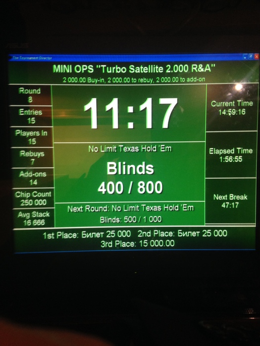 15:00 турнир Re- Entry по 3 000 руб. Гарантия 100 000 _ стартовый стэк 8 000 _ стэк на ReEntry 10 000 _ поздняя регистрация 8 уровней _ длительность уровней по 30 мин