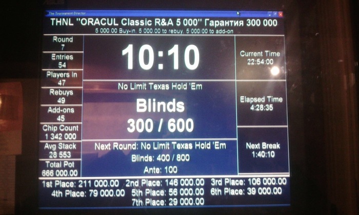 Начало серии получилось активным как никогда, со старта в R&A по 5 000 село 40 человек, призовой фонд 666 000 руб и его распределение после аддона получился следующим