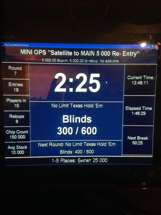 12:00 Turbo Satellite to Main Event в формате Re- Entry по 5 000 руб. Гарантия 100 000 (4 билета) _ стартовый стэк 6 000 _ стэк на ReEntry 6 000 _ поздняя регистрация 6 уровней _ длительность уровней по 15 мин
