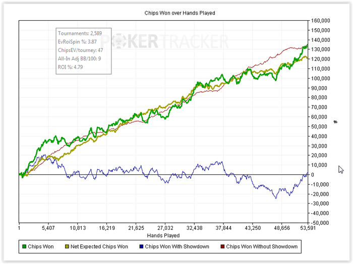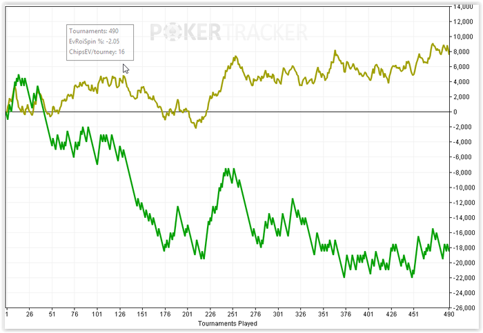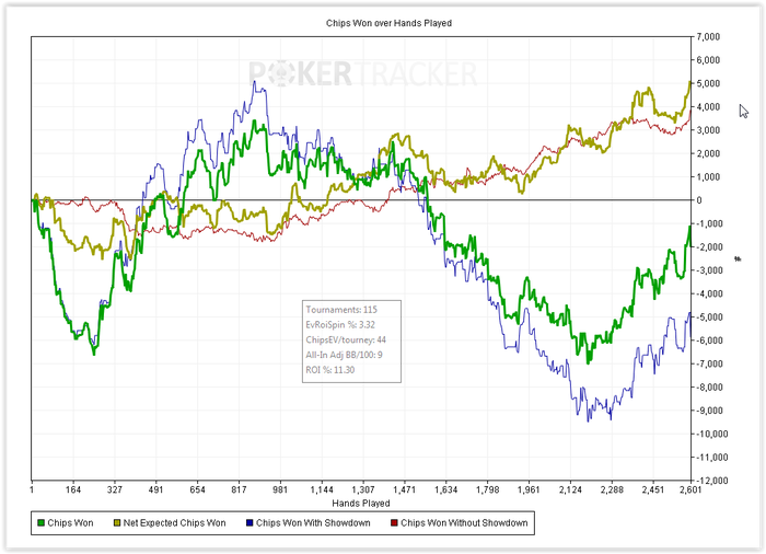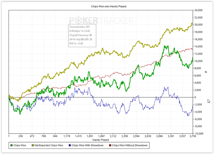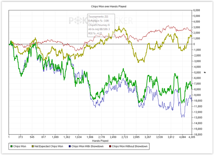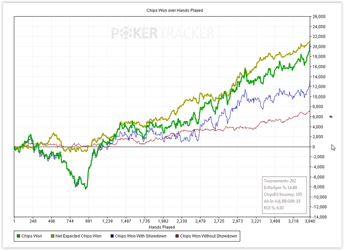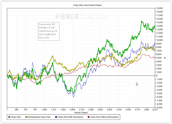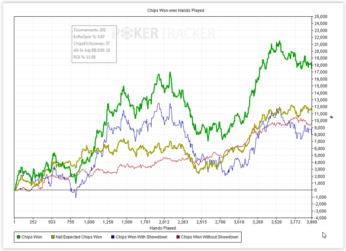 Итоговый график похоже всерьез отображает мой скилл. Это вот то, что я могу делать сейчас на четырех столах, ну может еще плюс 5-10 chipEv, если играть только в хорошей форме. Я не прирожденный топ хедзапа, определенно. Выход один - дохрена работы.