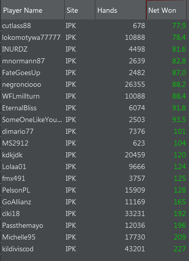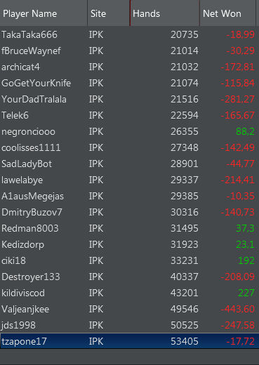 И очень часто даже вечером приходится довольствоватся одним не очень сладким фишом за столом, так как найти 6 хотя бы столиков с сладкой рыбой на десятках удаётся очень редко, по этому и винрейт практически не реально иметь высокий на данном лимите айпокера, да что уж говорить высокий, тут даже средненький винрейт очень трудно иметь. И это не мой пустой вывод, так как майнинга у меня уже за дней 40 накопилось, и знаете что? Максимальный + у одного рега это 25би за 50к рук, и кроме того даже слабо плюсовых регов просто единицы.