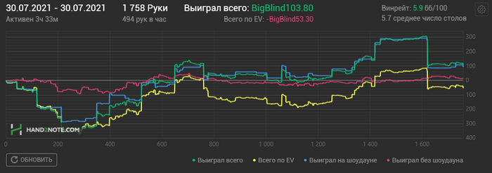 Стал играть реже и более короткие сессии (раньше мог 4000 раздач за одну сыграть с перерывами на туалет) из-за того, что не нравится собственная игра.