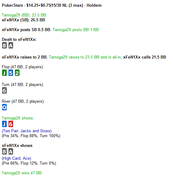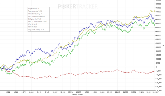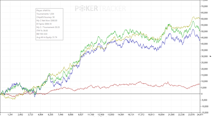Отыграл немного, около 5к игр. Я сидел и много фигачил теорию во время забастовки - и это мне картинку реальности исказило. Я решил, что раз основные дыры в игре устранил и для 15шек ролл прилично глубокий, а для 30ок слегка маловат - то можно сделать выстрел со стоплоссом. Кто же знал, что меня там такая недодача ждет (которая и на 15 сейчас не отпускает при ЕВ за 60 фишек на 1к игр). Идея без большого опыта прыгать выше так себе, но я не жалею. Считай, заплатил за инфу, что бояться там нечего, кроме перепадов по 1,5к$ и игру на СБ нужно дальше прокачивать.