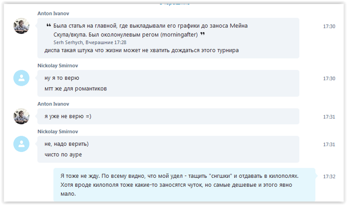 Я тоже без иронии уверен, что прорвет. Отпускает. Уже по крайней мере не заливаю сессию за сессией как раньше. Отмаз придет скорее постепенно, чем сразу. Уже обзавожусь обязательными атрибутами: работа над игрой в суперсекретной конфе, обмен нытьем, совместный обсёр лакопсов и топрегов-14-на-11. Результат будет на табло хкттб