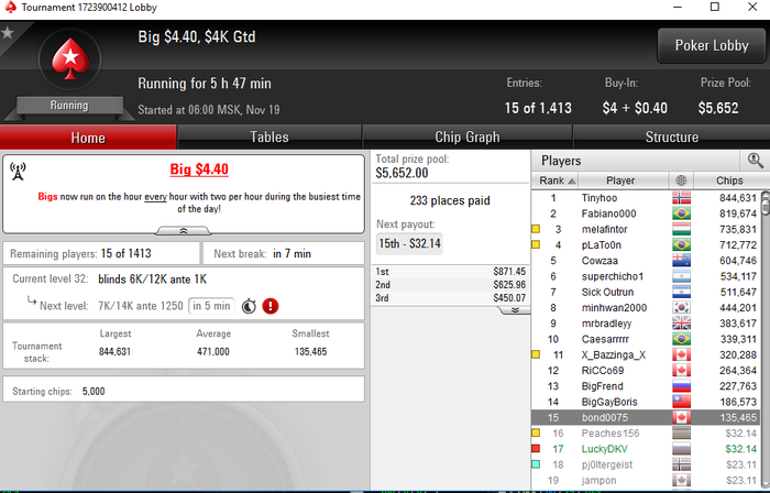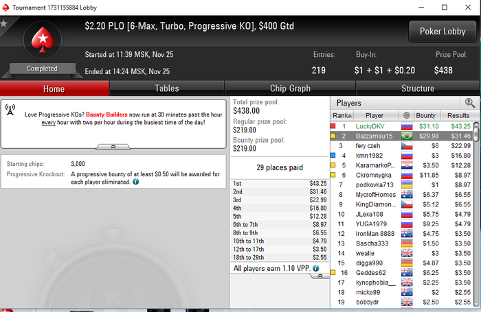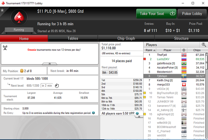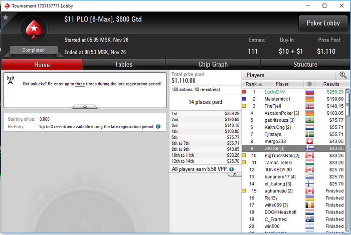 Вот такой вот дипранчик был, жаль, хорошо играл этот турнир, но малец не сложилось, в следующий раз обязательно подальше пройду) еще в дипе за 2.2 далеко прошел, но люди принимающие оллины на 95s или Q10 и меня лично выбили на J8
